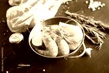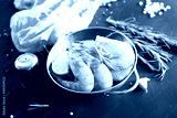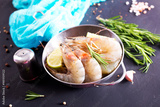 Uncooked Raw peeled tiger white shrimp prawn. Dark background.