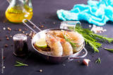 Uncooked Raw peeled tiger white shrimp prawn. Dark background.