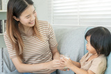 Asian young little girl learn at home. Do homework with kind mother help, encourage for exam. Mom pass on a glass of milk to daughter. Girl happy Homeschool. Mom teach and advice education together.