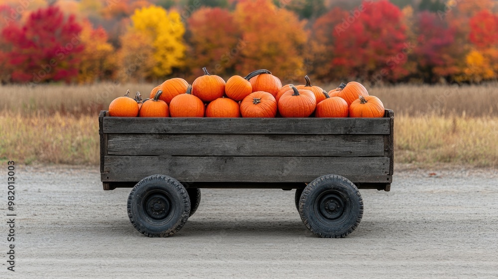 A wooden cart filled with vibrant pumpkins, set against a backdrop of colorful autumn foliage.