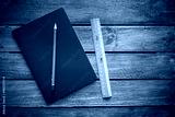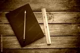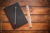 Closed notebook, pencil and old ruler on a rustic wooden board