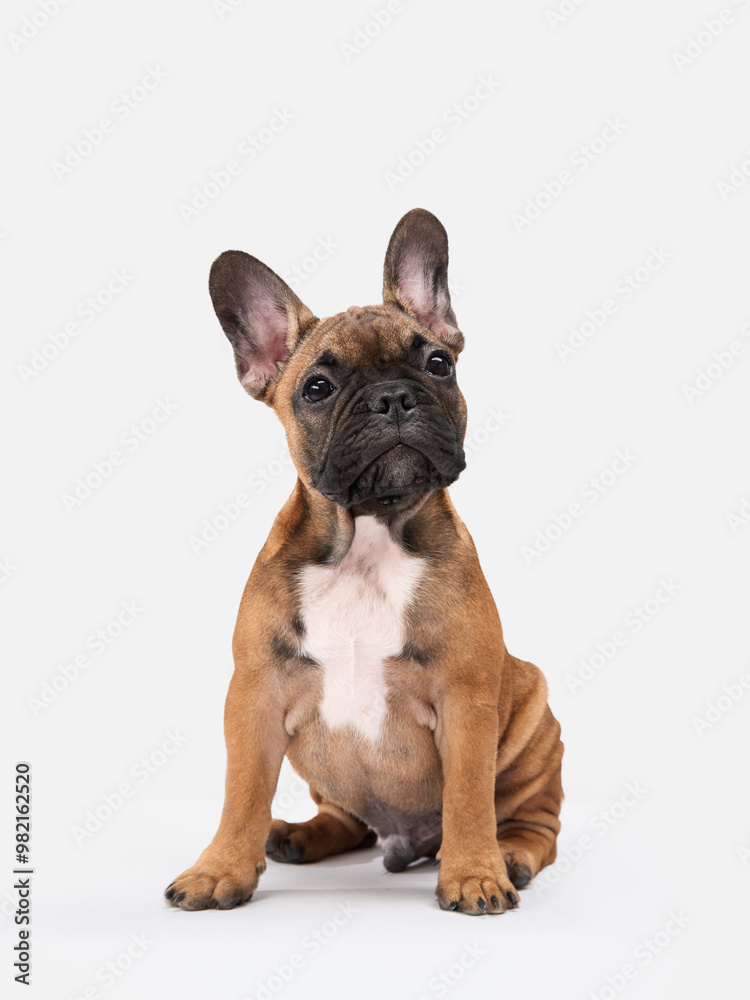 A sitting French Bulldog puppy is facing the camera with a curious expression on a neutral background. The image captures the puppy erect ears and strong build.