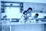 Baking, happy and black mom with kids in kitchen for bonding, learning and skill development in home. Mixing bowl, ingredients and African mother teaching children to cook for growth and fun at house