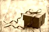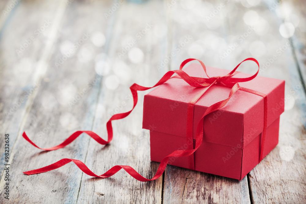 Gift box with red bow ribbon on wooden background for Valentines day, vintage toned
