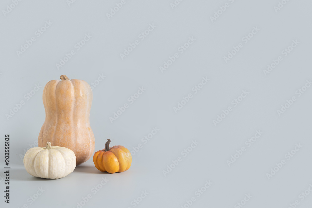 Banner of organic pumpkins for Thanksgiving Day or Halloween Party on pastel gray background. Autumn harvest. Copy space.