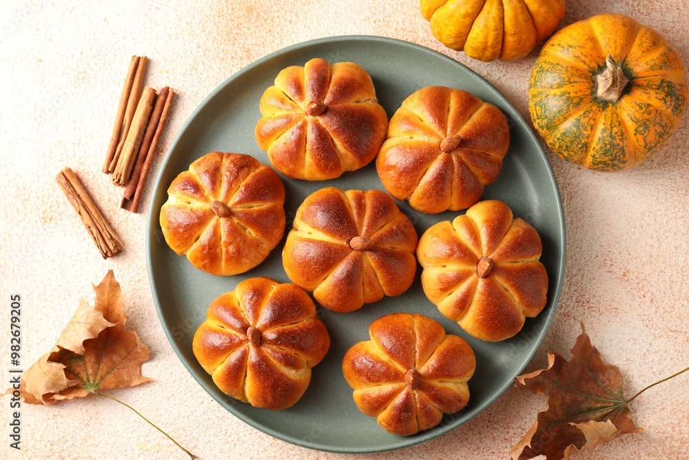 Tasty pumpkin shaped buns, ingredients and dry leaves on beige textured table, flat lay
