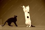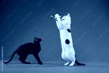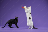 Playful kittens with toy, Vivid purple studio background. A black kitten watches as a white one stands on its hind legs to catch a colorful feather toy in a bright purple studio setting
