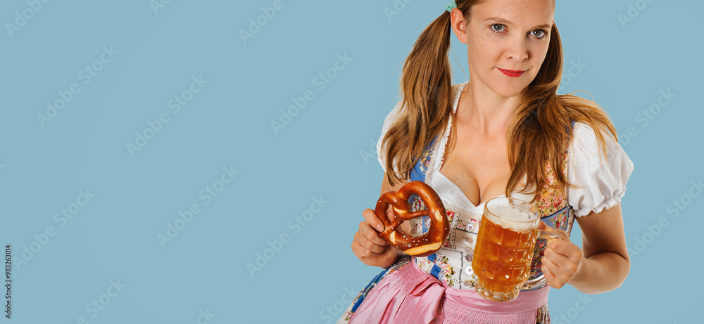 A beautiful young woman in traditional german dress holds a beer and pretzel isolated on free png background, oktoberfest concept