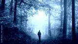 Hiker walking into the bright gold scene with illuminated fog in a dreamy forest. A landscape shot with beautiful cozy autumn mood