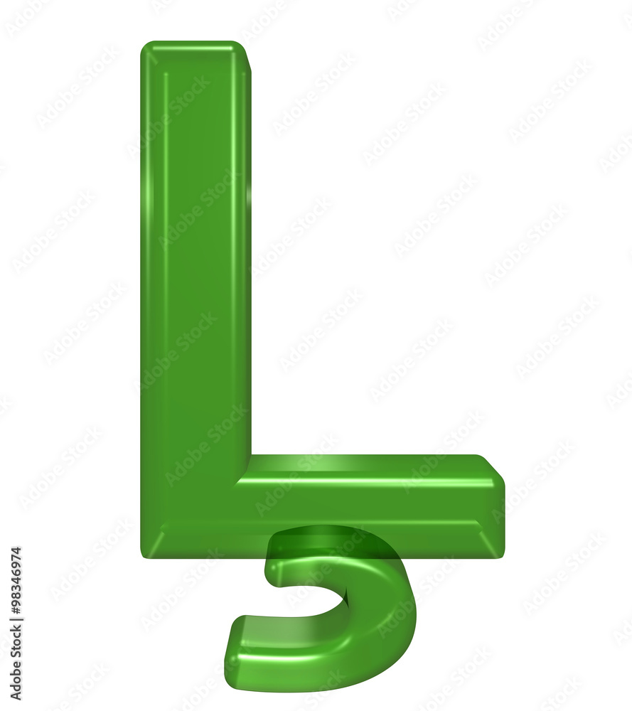 One letter from green glass alphabet set, isolated on white. Computer generated 3D photo rendering.