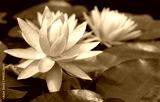 Close-up of pink water lilies floating in a pond. Green water lily leaves can be seen in between.