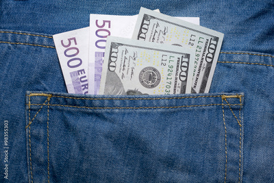 Dollars and euros in a jeans backpocket