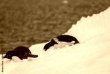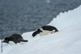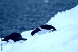 Close-up of two Adelie Penguins - Pygoscelis adeliae- laying on an iceberg, near the fish islands, on the Antarctic Peninsula
