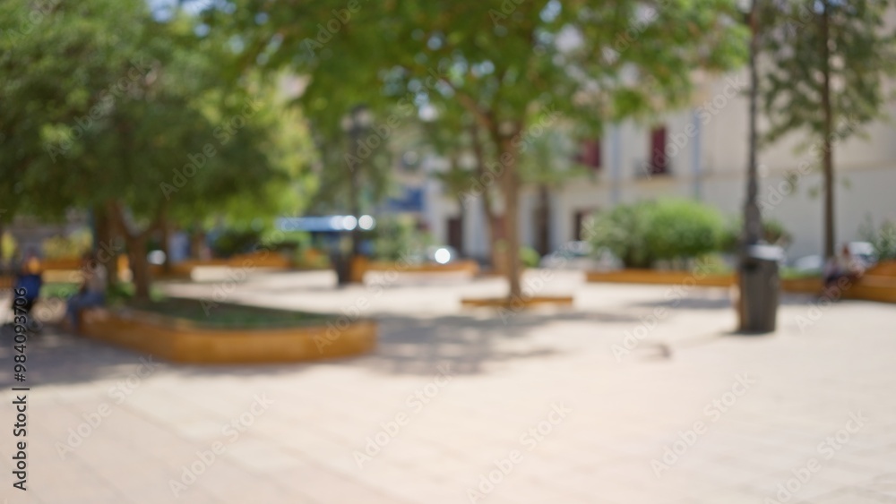 Blurry outdoor park scene with blurred background showing trees, benches, bokeh effect, and out-of-focus pathways in a bright sunny environment.
