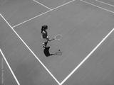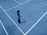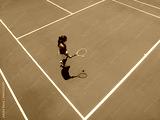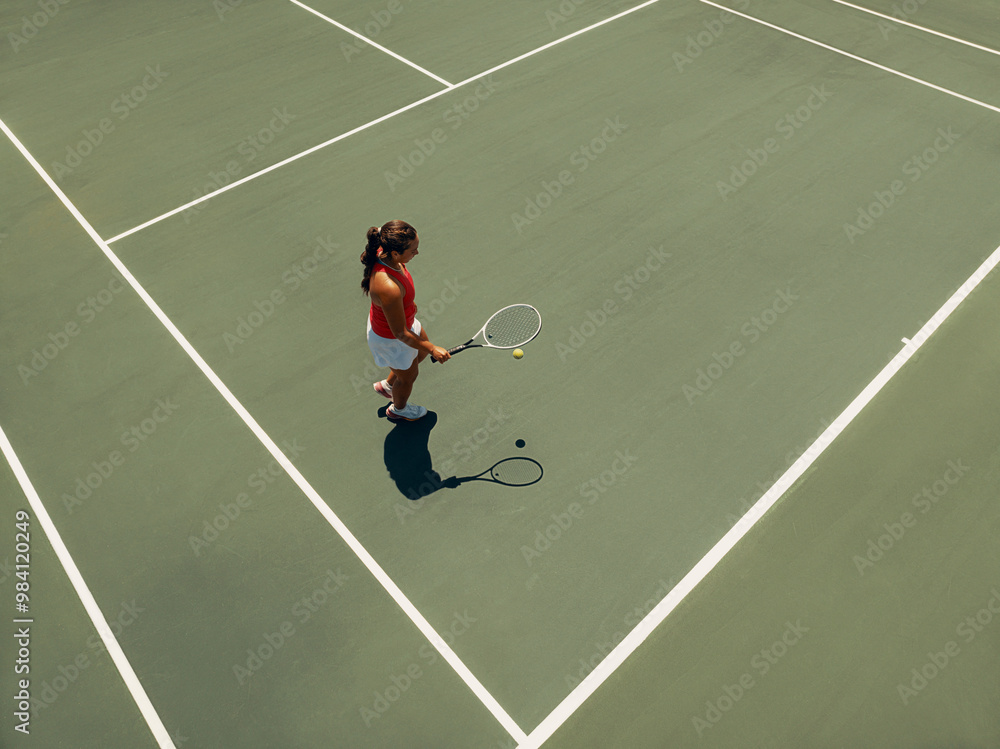 Aerial view of woman preparing to play tennis on a sunny day with ample copy space