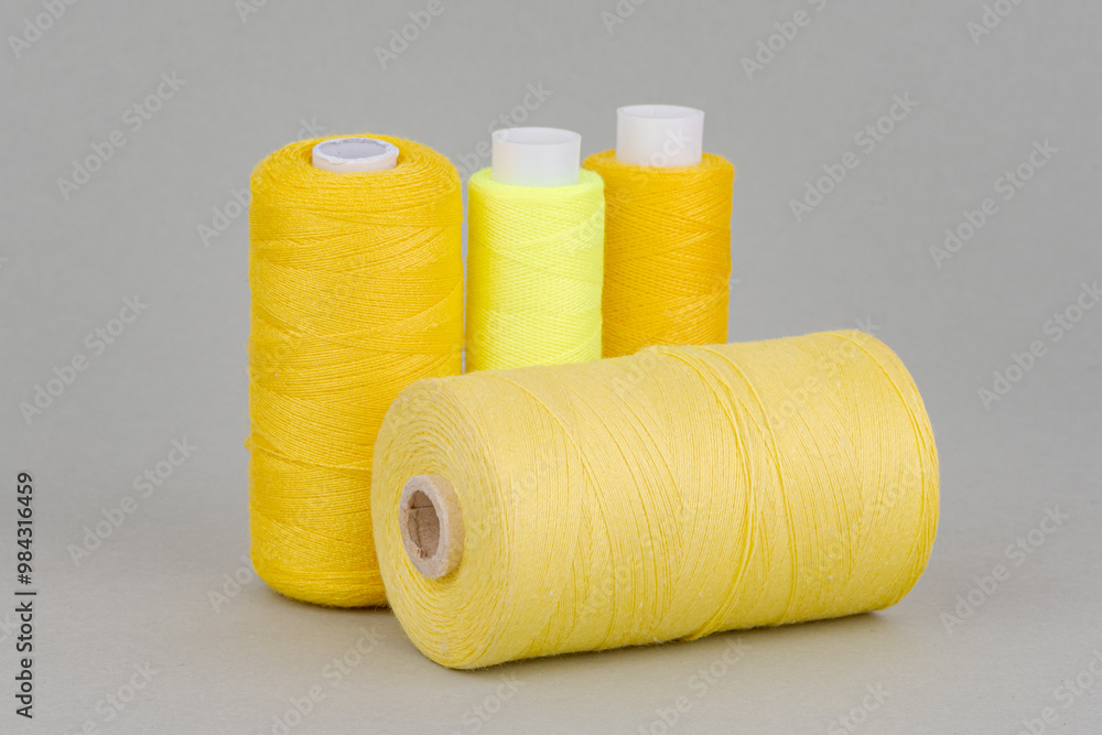 Yellow thread spools on grey background