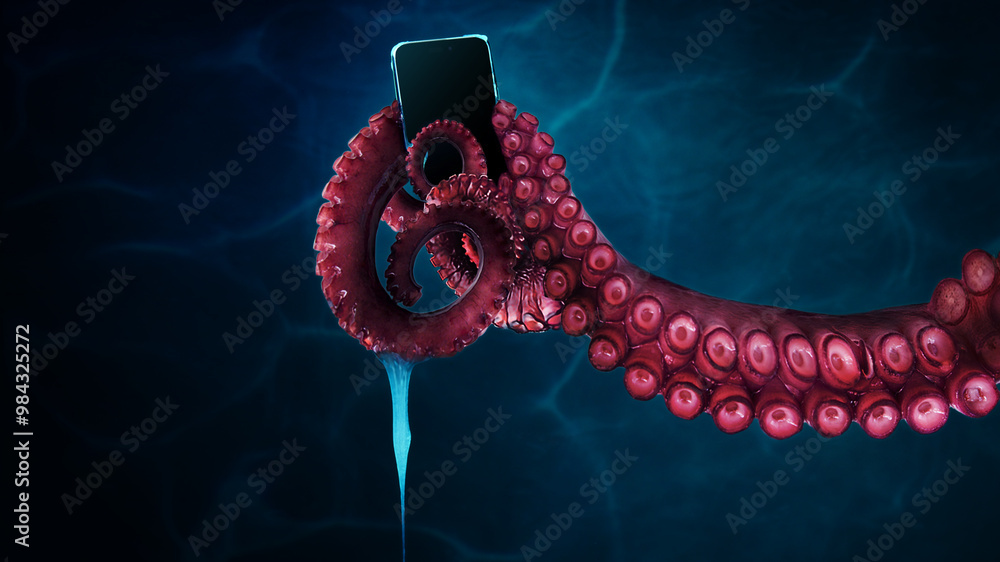 Octopus tentacle gripping smartphone with its suction cups, creating a surreal and unsettling atmosphere against dark background. Concept of Halloween theme, holiday. Copy space for ad