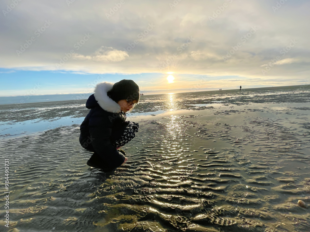 Cheerful little girl walking and searching shells on beach of North Sea during low tide on cold but sunny spring day.
