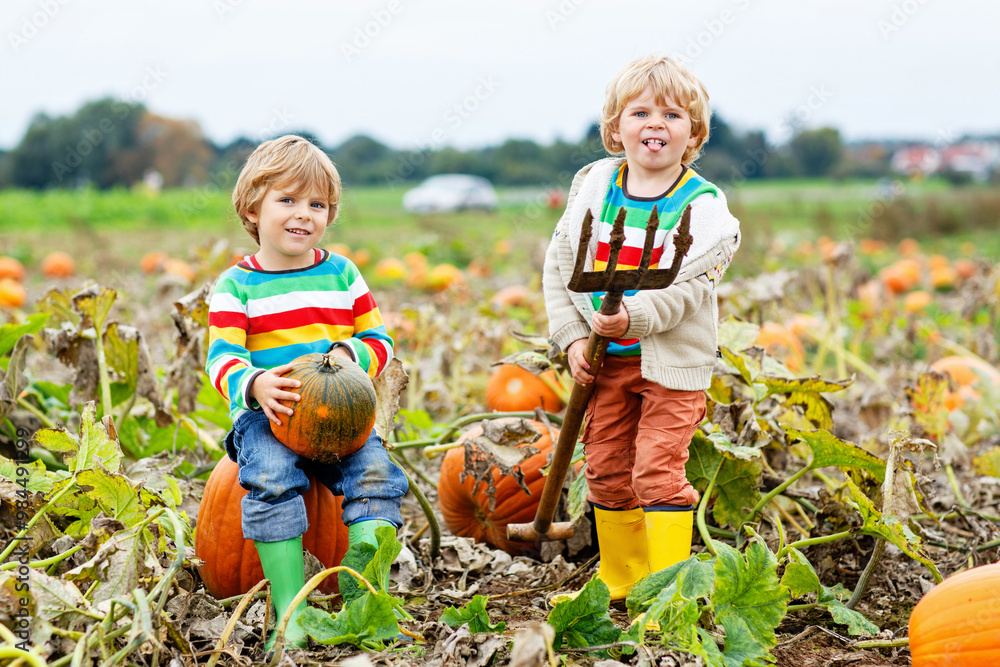 Two Little Children Enjoying Harvest Festival Celebration at Pumpkin Patch. Kids Preschool Boys Picking and Carving Pumpkins at Country Farm on Autumn Day. Halloween, Thanksgiving Time Fun for Family