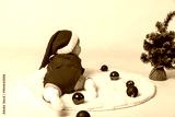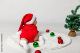Back view Christmas portrait of cute little newborn baby girl, wearing red Santa hat is crawling near Christmas tree and balls on a white background. Christmas and New Year concept.