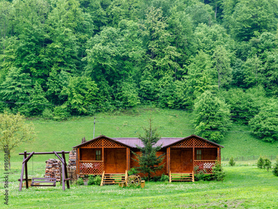 Wooden cabin near the forest. Wooden swing in front of the cabin