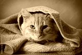 Portrait of fluffy red cat in blue towel, close up