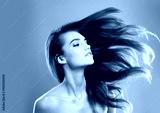 Beauty, hairstyle and flip with woman in studio for glow, volume and hair gloss treatment. Scalp health, makeup and growth with person on gray background for haircare cosmetics, salon and keratin