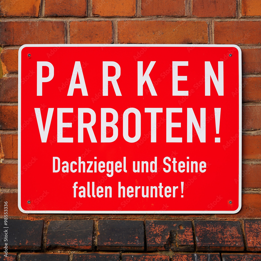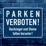 Schild mit der Aufschrift "Parken verboten, Dachziegel und Steine fallen herunter"