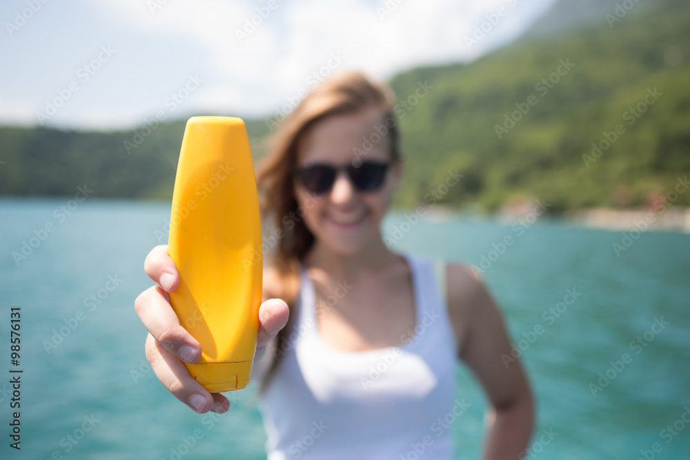 Sunscreen woman applying suntan lotion showing bottle. Beautiful