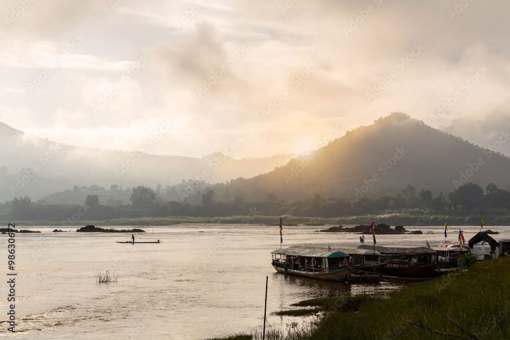 Misty morning on the khong river with Silhouette of boat in loei