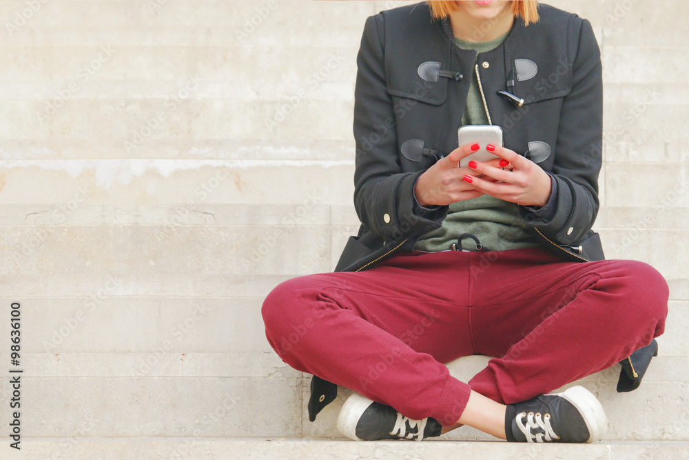 young female using smartphone - a partial view of a modern girl sitting on a stairway playing with phone