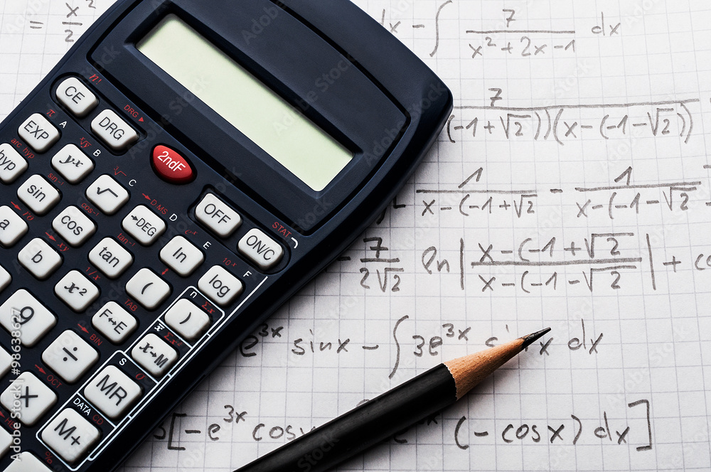 Maths concept - handheld calculator and pencil over a sheet of paper with maths-formulas