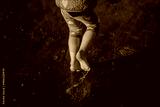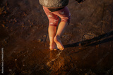 Small toddler girl running around in autumn on a wet beach sand with adorable little feet