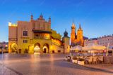 Evening view of Cloth Hall and Basilica of St Mary on Main Market Square in Krakow, Poland, illuminated at dusk