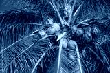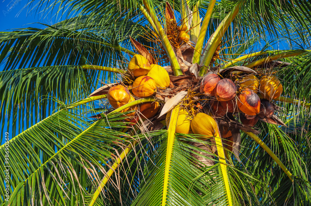 coconuts growing on a coconut palm tree with green foliage against the sky