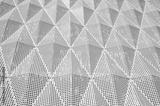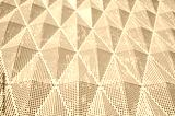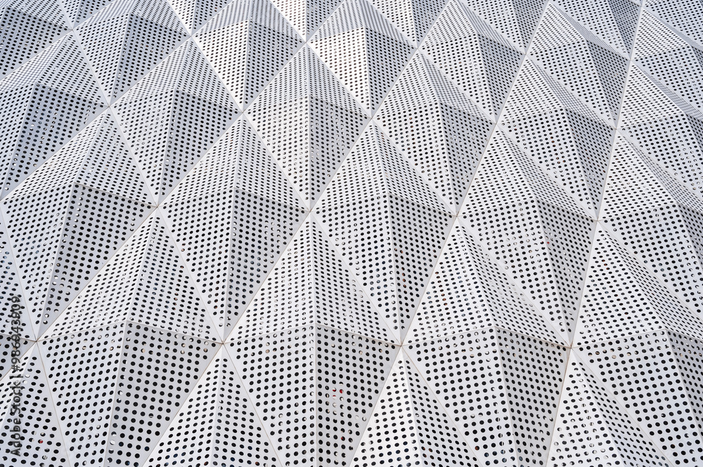 The futuristic facade of a modern building is covered with geometric metal aluminum panels