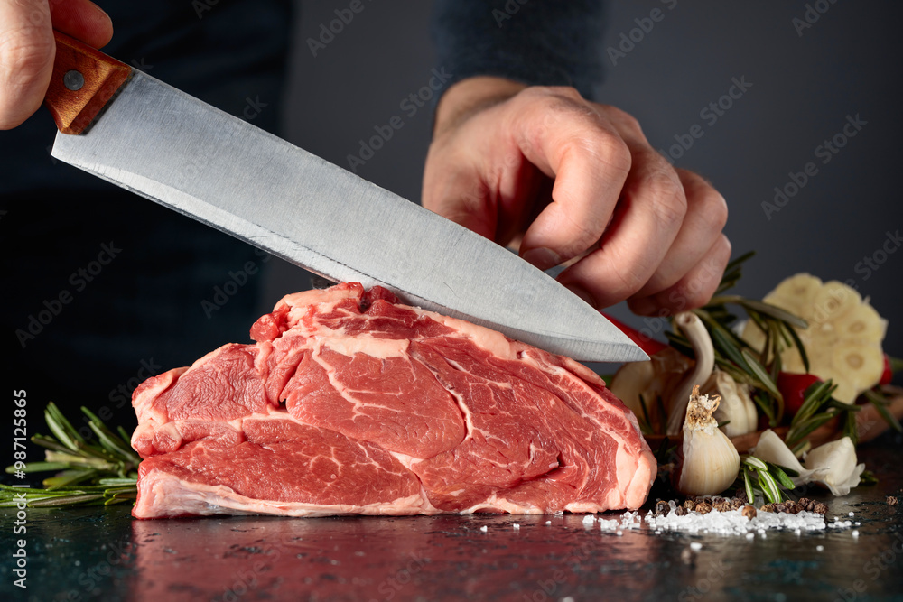 Chef cutting raw beef meat.