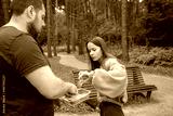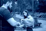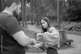 Man and woman eating outdoors, breakfast in the park with daughter and teenager, summer vacations with food.