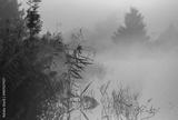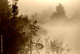 Jesienny, mglisty poranek nad stawem, wschód słońca.