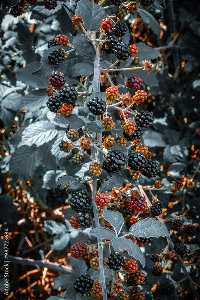 Bramble bush. Blackberries ripe and red ones ripening amidst green leaves. A close-up of a bramble branch laden with clusters of delicious, sweet summer berries. Nutritious and succulent wild fruit.