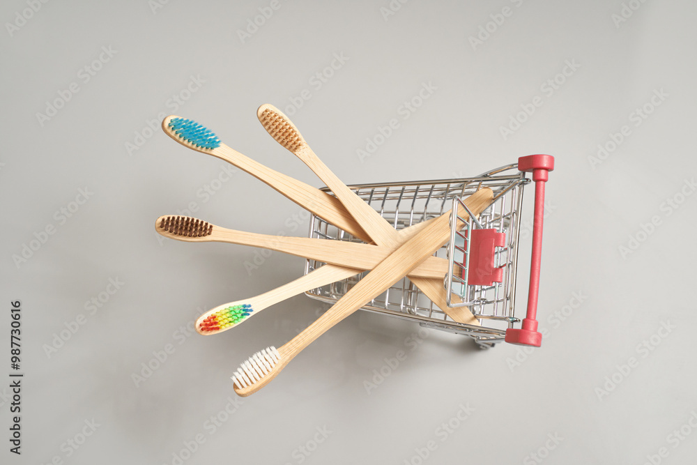 Eco friendly bamboo toothbrushes in tiny shopping cart for sustainable oral care and green living