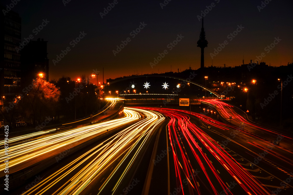 Traces of car lights at dusk driving along the Madrid ring road with the Piruli in the background