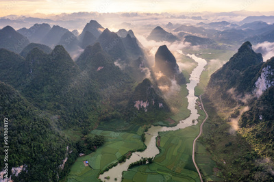 Rice terrace paddle field in sunrise at Phong Nam, Trung Khanh, Cao Bang, Vietnam