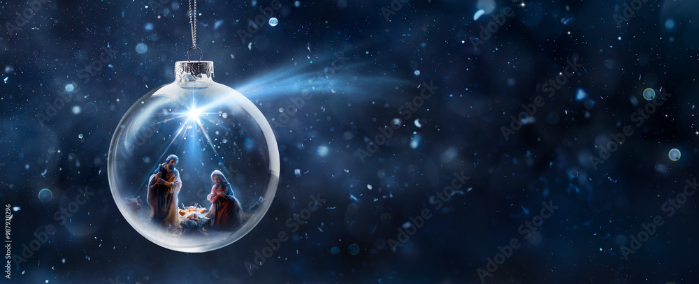 Nativity Of Jesus With Comet Star - Scene With The Holy Family In Globe Glass - Snowy Abstract Night