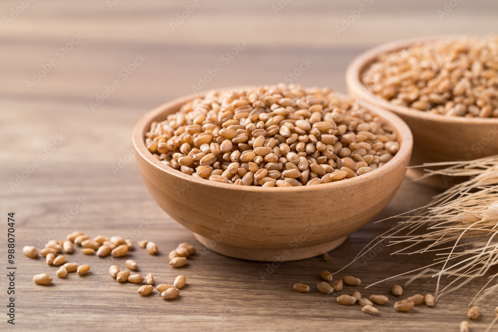 Whole wheat grain in wooden bowl on wooden background, Food ingredient