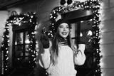 Night street portrait of young beautiful woman acting thrilled, wearing stylish knitted clothes. Model expressing joy and excitement with hands and face. Festive garland lights. Close up.