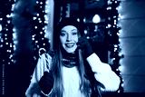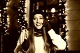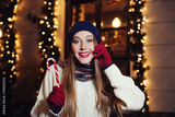 Night street portrait of smiling beautiful young woman speaking on mobile phone and looking at camera. Lady wearing classic winter knitted clothes. Festive Christmas garland lights. Close up.
