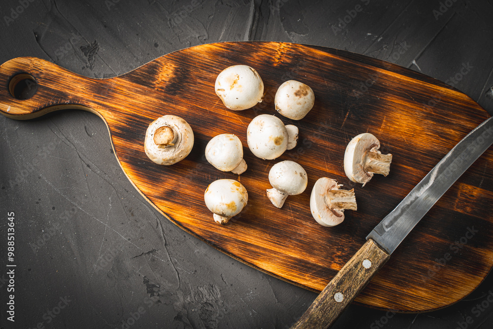 Mushrooms on a wooden cutting board on a dark background. Copyspace.