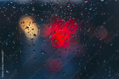 rain drops on window surface with colorful traffic bokeh light in background