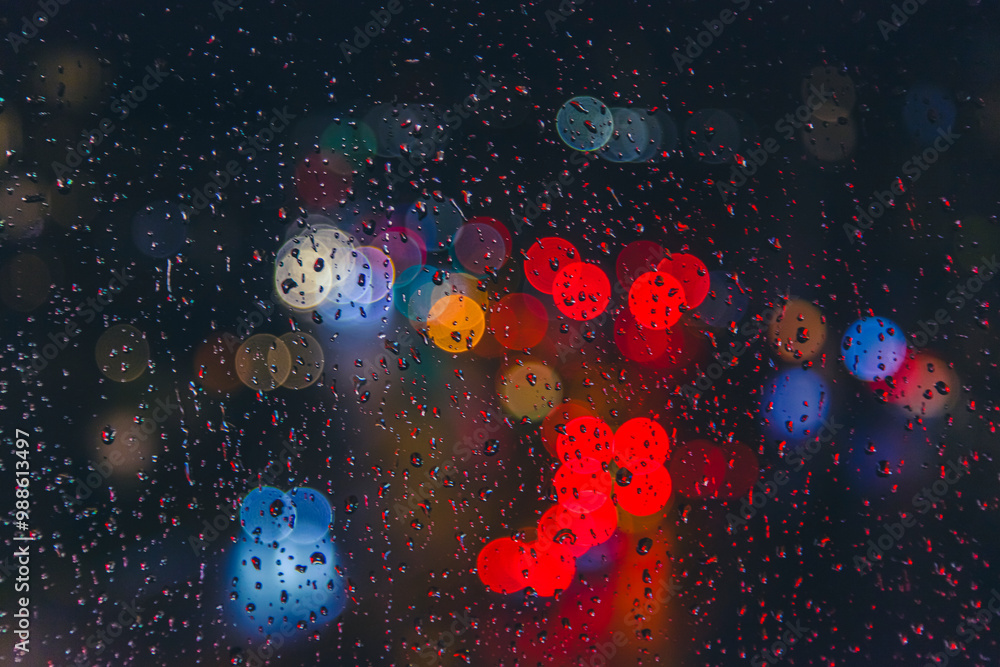 rain drops on window surface with colorful traffic bokeh light in background